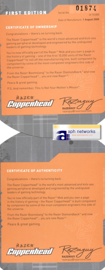 Here's what you get right out of the box. The driver CD is inside the manual, also included is some sheet that talks about profile settings, a certificate (More on this coming up) and of course, the mouse itself. Razer gave me a pleasent surprise when I discovered the replacement Copperhead was a "First Edition", which means it is the first 10,000 Copperheads to roll off the production line.