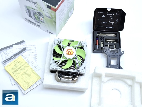 The retail box opens through a standard flap at the top. Once opened, one would expect to find the accessory box, the unit itself, several manuals, and the warranty information. The Jing is housed below the accessory box surrounded by two Styrofoam pieces that do a very nice job in keeping the heatsink safe and unharmed. The accessory box is actually quite a nice touch, as it includes all the necessary installation components within it, making installation much more organized. Also, one would not have to worry about where the components would go when uninstalling the heatsink. Within the accessory box contains the backplate of the Jing, which is used for both AMD and Intel processors. Also, Thermaltake has provided the user with a tube of stock thermal compound, some rubber grommets for vibration reduction, Intel and AMD installation brackets, and several different types of screws used during installation.