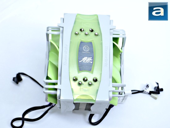 At first, I was questioning the fan placement of the Jing, because of the way it was hinged onto the heatsink. Of course, this small misunderstanding was soon resolved, as you can easily see Thermaltake has decided to switch one of the fans to face the other way to create the push-pull air cooling combination. Unlike other heatsinks, where it is usually clearly indicated which fan is pushing and which fan is pulling just by the bearing orientations, Thermaltake decided to have the orientation of the fans seem as if they are both pulling air. Thankfully, this is not the case; and in fact, I must admit that Thermaltake is actually quite brilliant as the fan orientation gives the Jing a more symmetrical look.