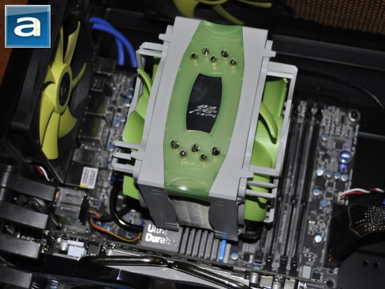 Securing the heatsink onto the brackets is most likely the easiest part of the entire setup. Simply place the heatsink on top, matching with the holes on the brackets, and use a screwdriver to tighten the premounted heatsink screws onto the brackets. Of course, we would need to apply thermal compound before this step. Something to note is that because the heatsink fins are fairly low, the 120mm fans may have a tendency to get in the way of higher profile RAM heatspreaders.