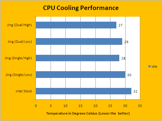 One reason for having such close results could be because of the rig I am testing with. Usually, it is most optimal to have a heatsink cooled using two fans (Push-pull). I have noticed with the Jing, the rear 120mm fan will end up being so close to the 120mm exhaust fan in my In Win Dragon Rider case that when the left 120mm fan is removed (Single fan setup used in the tests), there will still be a fairly effective push-pull combination from the 120mm push fan of the Jing in conjunction with the pull fan from my chassis' exhaust fan. In this sense, for most cases, the Jing will be able to perform relatively well with a one fan setup, so long as an exhaust fan is relatively close by.