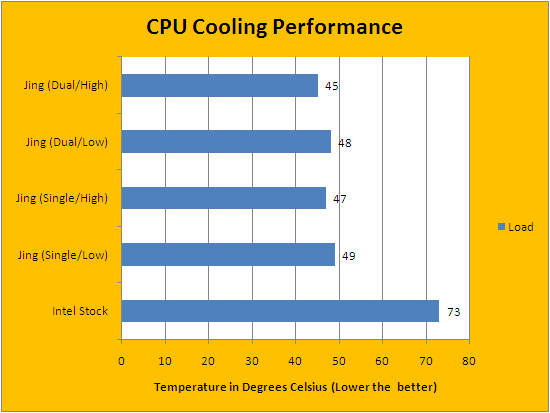 Under load conditions, we can see the true performance potential of the Thermaltake Jing. In this test, the Jing blows the stock cooler out of the water, keeping temperatures relatively cool in the mid to high 40's. Again, much like the results seen in the idle tests, the dual fan setup come out ahead with the 1300rpm fan settings, allowing the processor to reach 45 degrees Celsius, with the single fan setup at the same RPM trailing by just 2 degrees. Again, all of the temperatures above are quite close.