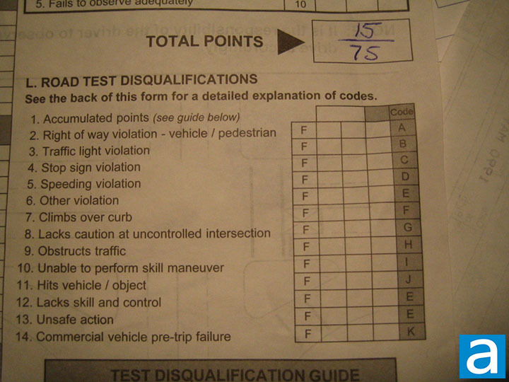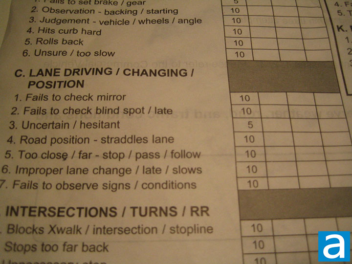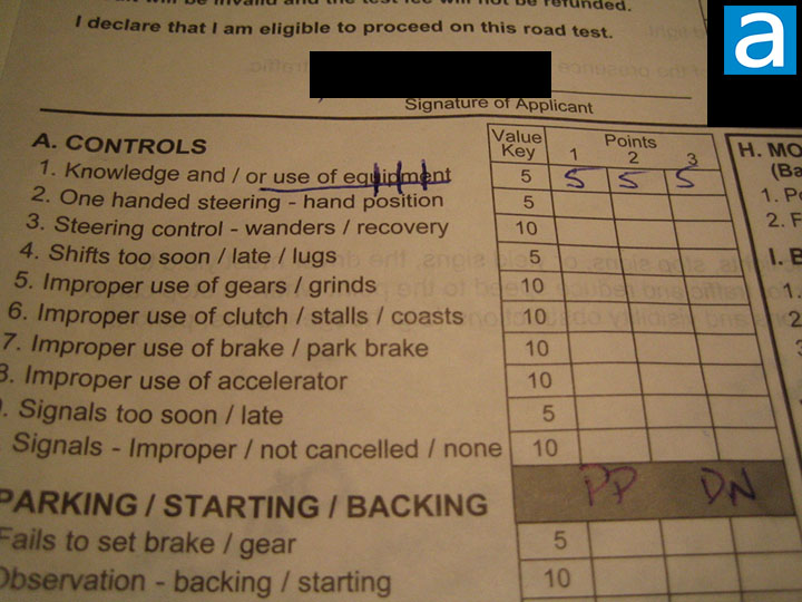 1. Just your car equipment in general, like signals, wipers, whatever. Better know how to use those. I didn't use the steering wheel correctly with hand positions on left turns, so I got owned 15 points. The guy can put that in category 2 as well.