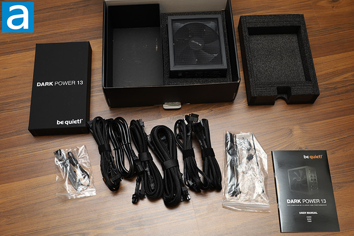 The be quiet! Dark Power 13 850W's retail package can be opened by a flap along the bottom. Upon opening the box, you will find the bundle is reasonable with few extras. What you will get is the be quiet! Dark Power 13 850W itself between two foam brackets, modular cables, AC power cable, Overclocking Key jumper, Overclocking Key expansion slot switch panel, five thumbscrews, four standard screws, six zip ties, five Velcro straps, and a product manual.