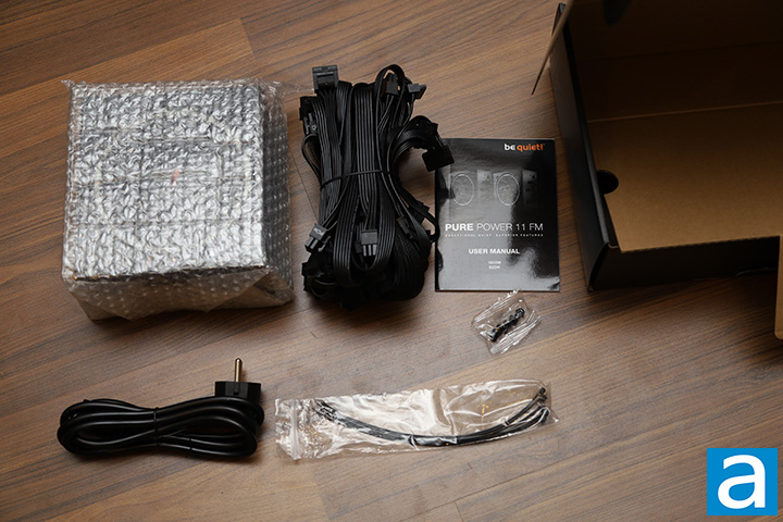 The be quiet! Pure Power 11 FM 1000W's retail package can be opened by a flap along the bottom. Upon opening the box, you will find the bundle is simple and with no extras. What you will get is the be quiet! Pure Power 11 FM 1000W itself inside a bubble wrap bag, four screws, AC power cable, modular cables, some zip ties, and a product manual. Someone accidentally shipped us the European version, which has a different power cable, but is otherwise the same thing.