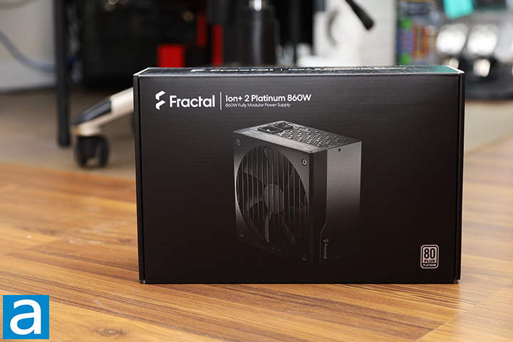 Inside the shipping box is the Fractal Design Ion+ 2 Platinum 860W's retail box. This is the second time I am reviewing a power supply from the company, and the box design has been updated to fit the company's latest design theme. The front is very clean in an Apple-like manner, featuring a black background and a photo of the power supply occupying a prominent spot. At the top is Fractal Design's logo, product name, and description. An 80 Plus Platinum badge can be found at the bottom right corner. The remaining sides of the box have feature highlights and specifications.