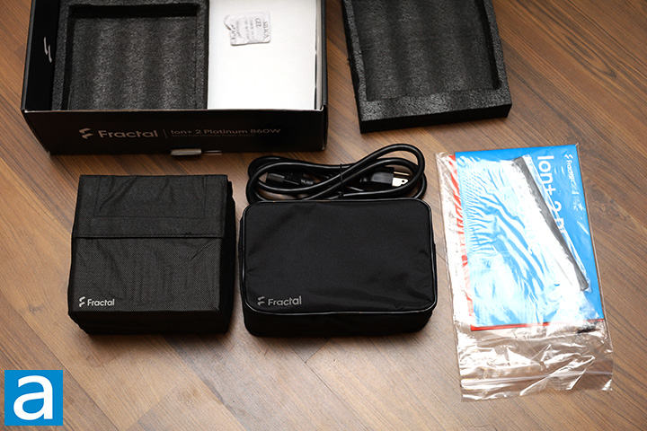 The Fractal Design Ion+ 2 Platinum 860W's retail packaging can be opened by a flap attached at the bottom. Upon opening the box, you will find everything is neatly organized. The power supply is placed inside a nylon bag and securely clipped in by two foam brackets. Cables are located inside a nylon zipper bag that looks like a big pencil case. A plastic resealable bag contains everything else. Out of the box, you will receive the Ion+ 2 Platinum 860W power supply itself, modular cables, AC power cable, four screws, user guide, and three Velcro straps. The bundle is simple and reasonable.