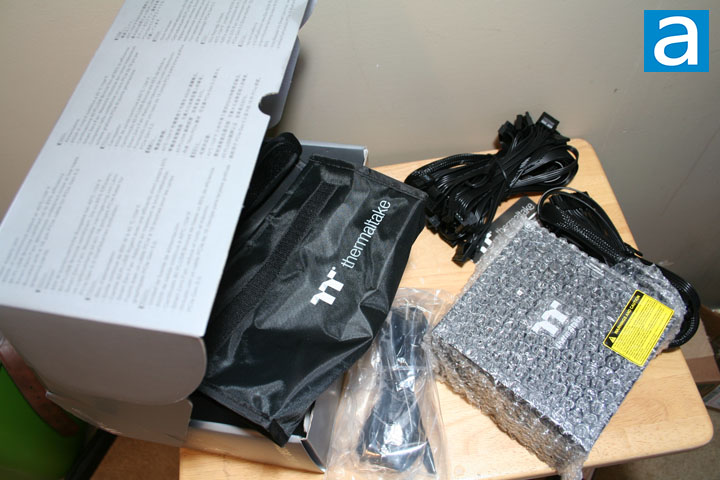 The Thermaltake Smart BM3 850W's retail packaging can be opened by a flap along the bottom. The power supply unit came to us placed inside bubble wrap packaging. The cables are bundled in a black Thermaltake bag. Thermaltake provided a warranty guide and an instruction manual for the power supply. Just to note, this PSU comes with a 5-year warranty, which is appropriate for the class.