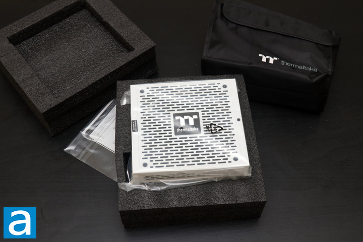Out of the box, we have the power supply wrapped in a clear plastic bag and held between two black foam pieces for cushioning. A separate Velcro nylon bag holds all of the modular cables, AC power cable, and mounting screws. We also have a clear bag that holds documentation and warranty information for the Thermaltake Toughpower GF1 Snow 750W.
