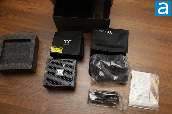 The Thermaltake Toughpower GF3 850W's retail packaging can be opened by a flap attached at the bottom. Upon opening the box, you will find everything neatly organized. The power supply is securely clipped between two foam brackets inside an open-ended black nylon bag. Everything else is located inside another black Velcro nylon bag. Out of the box, you will receive the Toughpower GF3 8500W power supply itself, modular cables, AC power cable, four screws, four zip ties, and some product literature. The bundle is very minimalist but sufficient.
