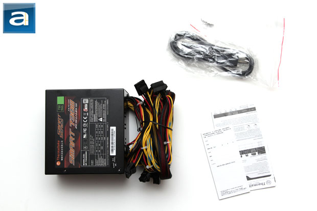 The Thermaltake SMART 730W's packaging is intrinsically simple. When they said "no gimmicks", they were not kidding, haha. After opening the flap top box, what you will get is Thermaltake SMART 730W power supply itself, one AC power cord, four screws, and two pieces of documentation. That's it. No zip ties, no Velcro straps, nothing -- just everything you would expect from a power supply intended for people on a limited budget.