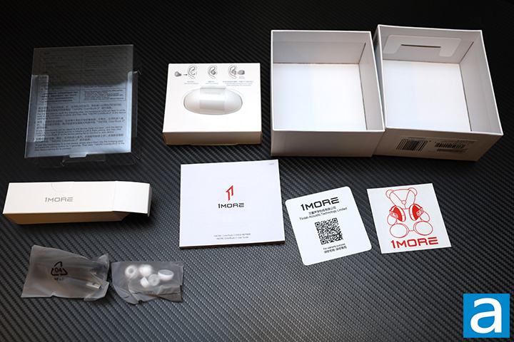 Opening the telescoping box reveals clear plastic cover with usage instructions printed on it. The bundle is quite straightforward as well. What you will get are the earbuds themselves, charging case, three additional earsleeve sizes in addition to the ones already installed, and a USB Type-C to Type-A cable for charging. Product literature included are a user guide in various languages, warranty card, and a sticker. There is no soft microfiber drawstring bag included, which is no different than the original ColorBuds True Wireless, but it is kind of strange because it seems to be a hit-or-miss in terms of which 1MORE products do and which ones do not.