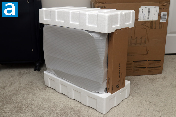 Out of the box, we have the Antec Performance 1 FT wrapped in an opaque white Styrofoam bag with two large Styrofoam brackets on the top and bottom. A separate cardboard box is also found here containing some case accessories that we will explore later on. Otherwise, it seems like the ripped edge did not have a negative effect on the contents of the box, which is good to see.