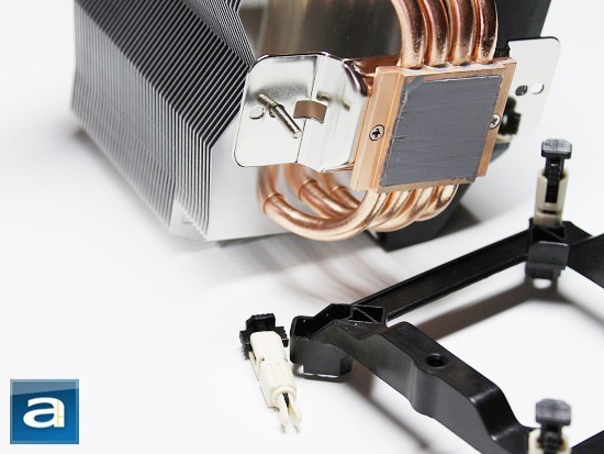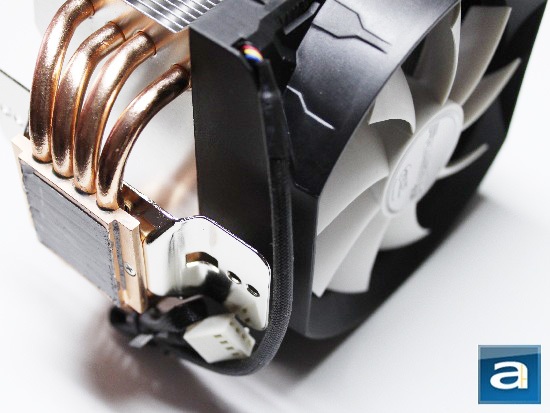 The Freezer 13 has a relatively flat base, so a good amount of surface area should come into contact with your processor. Four 6mm U-shaped wide diameter heatpipes lead away from the contact base, as shown in the image above. The Freezer 13 incorporates copper heatpipes and a copper base for best transfer of heat, as copper has a specific heat capacity of 0.385J/g°c. The heatsink fins are purely made of aluminum to lighten the overall weight, allowing the construction of larger heatsinks without placing too much stress on the motherboard. The heatpipes are not soldered inside the base, but are rather held in place with some sort of thermal glue, as characterized by the dark gray material around the base-heatpipe interface. The fins themselves are pressed onto the heatpipes for a secure fit. Unfortunately, this type of design means after a number of heating and cooling cycles, due to minute differences in magnitude of expansion and contraption of different parts of the heatsink, your Freezer 13 will inevitably degrade in performance over time.