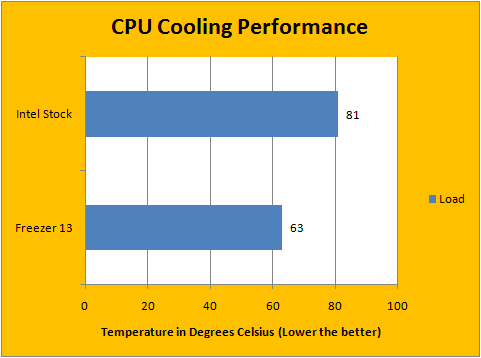 Funny that they brought it up, but Arctic Cooling's website advertises the Freezer 13 as 18.5c lower than the Intel stock cooler on an Intel Core i7-920. Once loaded up, our Intel stock cooler was not entirely capable in keeping the temperatures in check, stabilizing at an unacceptable 81c. The difference recorded in my tests coincided with Arctic Cooling's results with a difference of 18c, with the Freezer 13 keeping it at a relatively safe level of 63c under full load. Not bad at all!