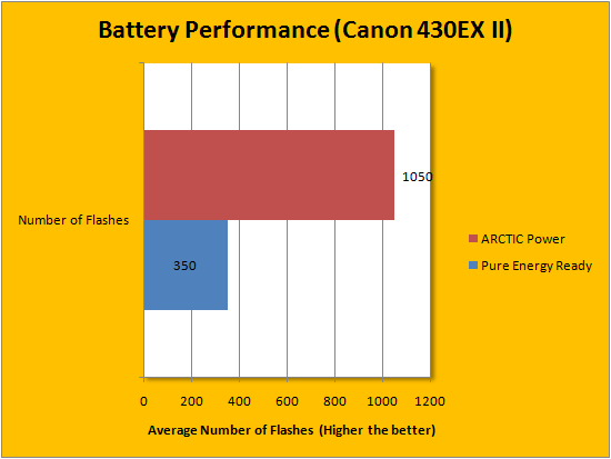 Using my Canon 430EX II under regular usage, the average amount of flashes I was able to obtain on my Pure Energy Ready low discharge NiMH batteries was about 350, as shown in our graph above. The ARCTIC Power 2650mAh rechargeable AA batteries took that number up to an impressive 1050. However, do keep in mind these are my average numbers; the flash power can vary according to the power setting on the Speedlite. A quick calculation indicates the amount of flashes I was able to get out of the ARCTIC Power is about three times as much as the Pure Energy Ready batteries -- which makes sense, because the ARCTIC Power is a little more than three times the size of their Pure Energy counterparts. Any lost shots can be attributed to stuff like power settings as aforementioned, variation in manufacturing capacity, and possibly self discharge. It takes longer to finish a real life test cycle on the ARCTIC Power rechargeable batteries, and while we wait, it loses some power by itself, too.