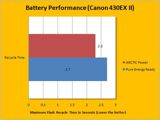 One thing often not tested with rechargeable batteries is its real life performance in demanding applications like external dSLR flashguns. While having a large capacity is certainly crucial to any battery product, its recycle time after a full power flash discharge is also extremely important to demanding photographers. As the ARCTIC Power NiMH rechargeables delivered an impressive amount of flash cycles to my 430EX II as shown on our last graph, the tested recycle time is also quite decent. My Pure Energy Ready batteries required 2.7 seconds to recycle from a full power flash discharge, but the ARCTIC Power bested it by 0.4 seconds. However, what the graph doesn't tell is the ARCTIC Power only the 2.3 second figure is only achievable when the batteries are fully charged. When the battery depletes past half way, don't be surprised to get recycle times in the 10 second range -- a figure most photographers would consider something better measured with a calendar instead.