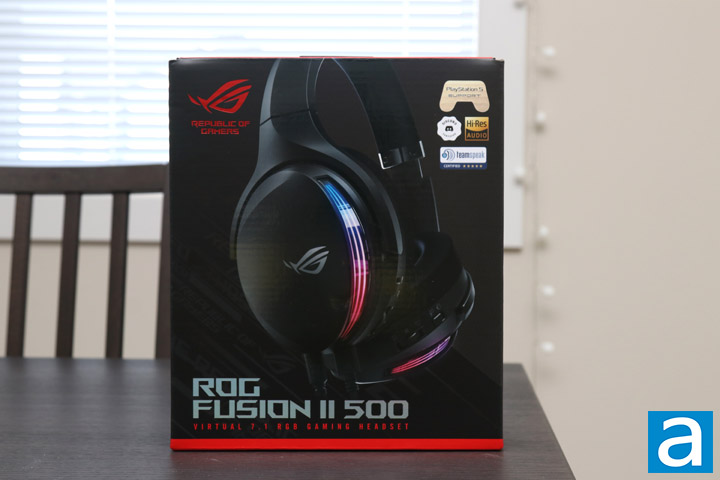 Following with other ASUS ROG products, the ROG Fusion II 500 comes in a black and red retail container. The gaming brand logo can be seen on the top left corner. In the middle is a side profile view of the headset with the RGB bands illuminated. At the top right corner, we have several labels to show its certifications like Discord, TeamSpeak, Hi-Res Audio, as well as its PlayStation 5 support. At the bottom, we have the product name with a descriptor of "Virtual 7.1 RGB Gaming Headset". Around the box, we have some features and specifications with a bigger breakdown of the large features at the back of the box.