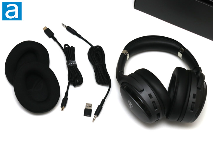 Accessories: User guide, ROG Hybrid ear cushion, 3.5 mm cable, USB-C cable, USB-C to USB-A adapter dongle