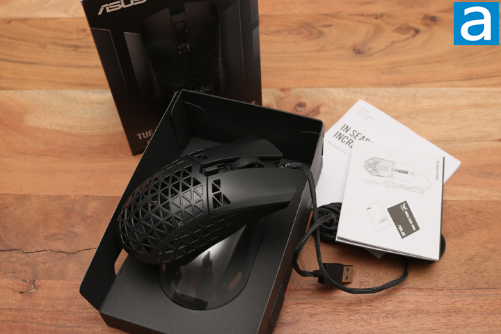 The ASUS TUF Gaming M4 Air’s packaging is fairly consistent with any other mouse. The top opens up, which allows you to slide the entire housing of the mouse out. The M4 Air is settled neatly behind a plastic shell to protect it from any surface damage. The cable is neatly wrapped up in a silicone cable tie. Manuals and other documentation are found behind the mouse. Continuing its clear focus on being a lightweight mouse, there really is nothing else included.
