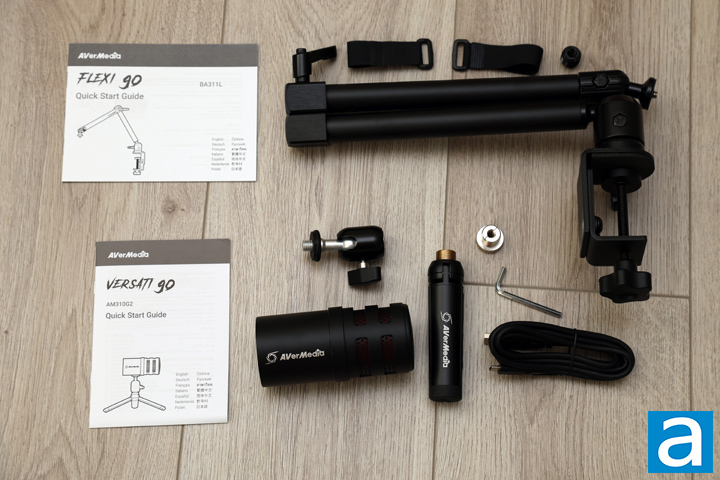 When you open the retail containers, you will see AVerMedia has packaged both of their products in the same way. The microphone and its arm are in a large foam shell, with cutouts for the products and the accompanying accessories. Everything in the VERSATI go AM310G2 box is in separate plastic bags to prevent surface scratches. These accessories include a swivel tripod mount, tripod, 2m USB Type-C to Type-A cable, 5/8" to 1/4" adapter, and manual. The arm is on its own with another small bag holding some of its accessories. These include a 1/4" to 5/8" thread adapter, two hook and loop straps, and a quick start guide. The manufacturer has packaged and protected everything well, so let us take a closer look at the products themselves.
