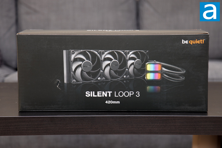 The be quiet! Silent Loop 3 420mm has a subdued box design, which lines up with the branding and other products from be quiet! On the front, the product is displayed scaled down. It is also illuminated to show the RGB LED lighting on the water pump and block combination. Underneath, there is the product name along with the specific size inside. We received the largest 420mm model, but be quiet! also offers this in 240mm and 360mm versions. On the top right corner is the manufacturer's logo. Around the back, we have a few more specifications and features, but words and details are kept to a minimum.