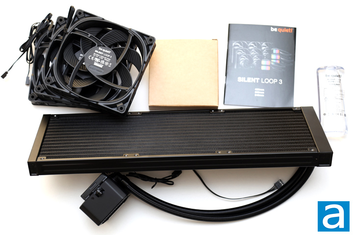 As with most all-in-one coolers, everything is held in a single cardboard carton inside the retail container. Most of the components are wrapped in plastic bags to prevent damage to the components. The radiator is also sheltered with a white cardboard sleeve, which should be better at preventing the radiator from getting dinged up while it is in the box. The be quiet! Silent Loop 3 420mm supports most modern sockets, including Intel's LGA 1851, LGA1700, LGA1200, and LGA115x, as well as AMD's AM4, AM5, TR4, and TR5. All the necessary mounting equipment is included for these sockets and contained in a separate cardboard box with individual bags inside. A bottle of coolant is also provided for topping up the radiator, which is something be quiet! has included with most of their AIO coolers. Three 140mm be quiet! Silent Wings 4 PWM fans are contained in their own bag. Otherwise, there is some documentation included to help users with the installation process.