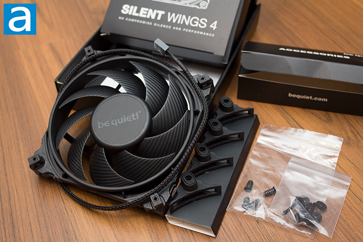 Our packs of the be quiet! Silent Wings 4 arrived as singular fans with its included mounting fittings. Within the box were two boxes, one containing the fan, and the other containing the accessories. The fan fit snug into the box, having the wire wrapped nicely around the rim. The accessories contained the screws and different mounting fittings. Underneath both of these boxes contain two pieces of paper regarding warranty and instructions for the two fitting options. The minimalist and organized packaging was very nice and clean. The claim of a premium brand shines through in the packaging methods.