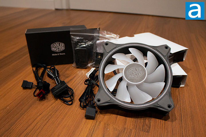 Our pack of the Cooler Master MasterFan MF120 Halo arrived as a kit with three fans and an ARGB controller included. The fans were wrapped in white cardboard, while the ARGB controller, some screws for fan mounting, cable clips, and any necessary cables were packed into a black box with the Cooler Master logo on it. The box also contains a user manual containing contact and setup information. Cooler Master was kind enough to cover the pins to prevent them from being bent in transportation.