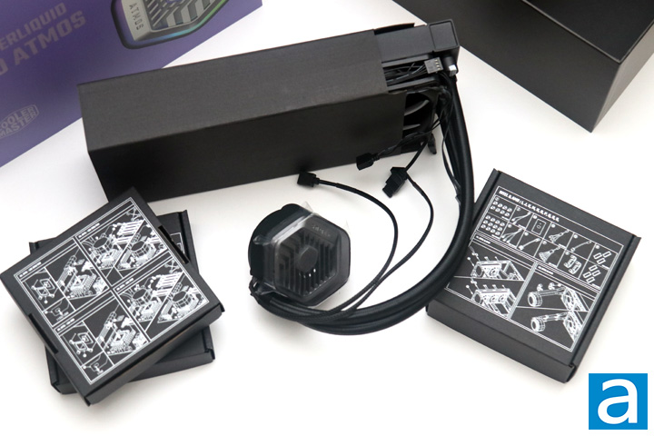 There is a total of three accessory boxes here. The first two boxes are marked AMD and Intel, and these are used to separate the necessary hardware for the respective sockets. As you can see from the specifications, the MasterLiquid 240 Atmos can be mounted on most modern desktop sockets, including Intel's LGA1700, LGA1200, LGA1151, LGA1150, LGA1155, and LGA1156, and AMD's AM5 and AM4. The last box is the general accessories box, which contains items for installation that are used for any install. This contains accessories like a tube of retail-grade CryoFuze thermal paste, an addressable RGB LED lighting controller, and fan header adapters to control the fans, among other things. No manuals will be found here, as they are printed on the box itself. A QR code for an online link to the manual can be found inside the general accessories box if you need additional help during the installation process. Overall, I think the packaging is effective in protecting and separating the equipment, all while reducing the use of plastic.