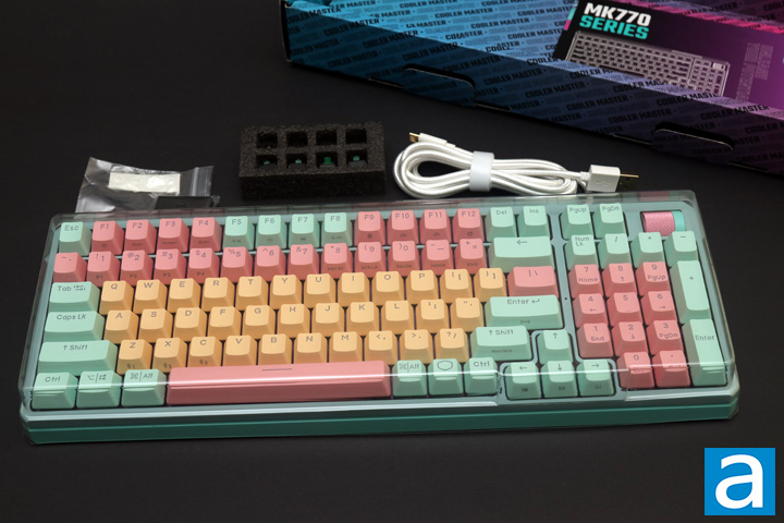 Out of the box, the Cooler Master MK770 comes with a pretty standard set of items. Out of the box, the keyboard can be found with a hard plastic shell to protect it while in transit. Next, we have a white braided USB Type-C to Type-A cable measuring 1.8m in length. In one small bag, we have a USB Type-C to Type-A converter, which works in conjunction with the included cable to make the USB wireless transmitter position more flexible. Finally, we have a combination keycap and switch puller. We will see how this will come in handy later on in our review. Otherwise, we have some paper materials concerning the quick start and warranty information. As expected from most Cooler Master peripherals, we have a standard two-year limited warranty coverage.