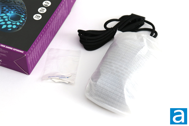 Out of the box, we have the Cooler Master MM711 Blue Steel in a foam bag. This is done so to protect the mouse from any scuffs or damage as well as preventing things from getting into the mouse. The box also includes some extra PTFE feet to replace the skates on the bottom of the mouse after prolonged use. We also have a bit of documentation with the MM711 Blue Steel, but there is not much to speak of in this regard.