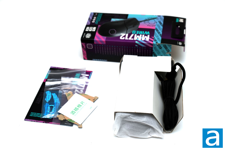 Similar to the unboxing experience of other Cooler Master mice, the MM712 Wired comes in a white Styrofoam bag with its cable bundled beside it. A white cardboard shell holds the mouse in place so it does not rattle around and is protected while in transit. Included with the MM712 Wired is another set of PTFE feet, set of grip tape, and an alcohol wipe to clean your mouse before applying the tape. A small manual is also included to specify quick start usage and to talk about warranty. As expected, this mouse comes with a standard 2-year warranty. One thing I did notice was Cooler Master mentioned a USB adapter being included out of the box, but I did not receive one. Whether this is an issue with the review samples or a mislabel on the early boxes, hopefully this will be resolved for those looking to buy one.
