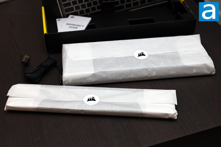 Out of the box, I was immediately impressed with the recyclable or reusable materials used to pack the Corsair K70 PRO TKL. The keyboard is wrapped in a paper material that feels like a combination of vellum, parchment, and tissue paper. This makes the paper a bit more durable. Next, there is a smaller wrapped bundle containing the wrist rest. Finally, there is a 1.8m USB Type-C to Type-A rubber cable, which Corsair claims is tangle free. During my use, it has remained untangled so far. Lastly, a small amount of documentation is included, covering warranty and safety information. The Corsair K70 PRO TKL comes with a standard two-year warranty.