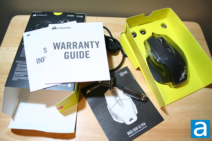 Right out of the box, the first thing you will see is the mouse itself. The mouse alongside its USB cable is bundled in some plastic wrap, which is placed securely in a yellow plastic covering. The user manual and warranty guide were also found inside of the box, as one would expect. The warranty, per the specifications, is two years, which is common for peripherals.