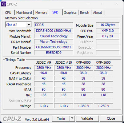 Our ASUS ProArt Z690-Creator WiFi motherboard used for testing had no issues detecting and working with the Crucial Pro Overclocking DDR5-6000 right out of the box using the latest BIOS revision. Above, we have a screenshot of the memory tab in CPU-Z with the SPD timings table. This reads standard JEDEC specifications programmed into the memory as well as XMP data for running the memory at various speeds. This kit of Crucial Pro Overclocking DDR5-6000 2x16GB retails for as low as $93 at press time.