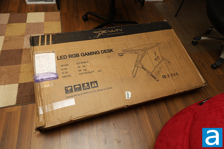 As you can see in our photo above, E-WIN's shipping box is also the retail box, given the company sells directly to you via their online store. What you get is a brown corrugated cardboard box with classic black ink. On the box, you will find E-WIN's logo at the top, the text "LED RGB gaming desk", basic specifications, regulatory logos, and a drawing of the desk.