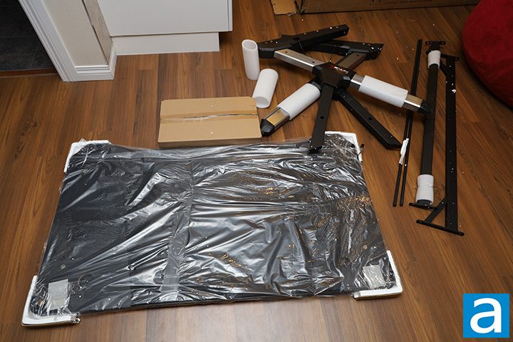 Out of the box, you will receive everything you need to build the desk. These include the tabletop, left and right X-style table legs, two banner poles, E-WIN banner, two horizontal support braces, and all the assembly hardware and accessories inside a smaller cardboard box.