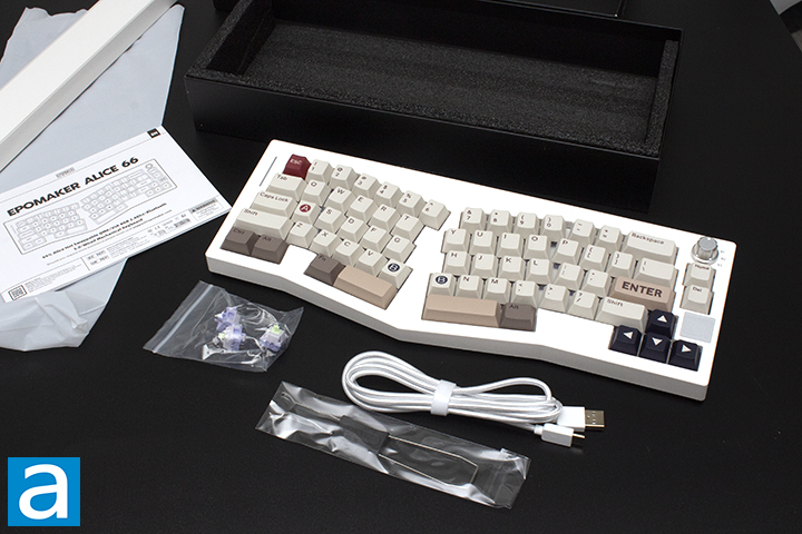 Out of the box, you will receive the Epomaker Alice 66 keyboard with a cable, keycap/switch puller, 2.4GHz dongle, extra switches, and a user manual. The keyboard is wrapped in plastic to prevent any surface scratches. I was quite pleased when it came to packaging. The quality of the packaging is better than most manufacturers as the foam usage surrounds the majority of the keyboard.