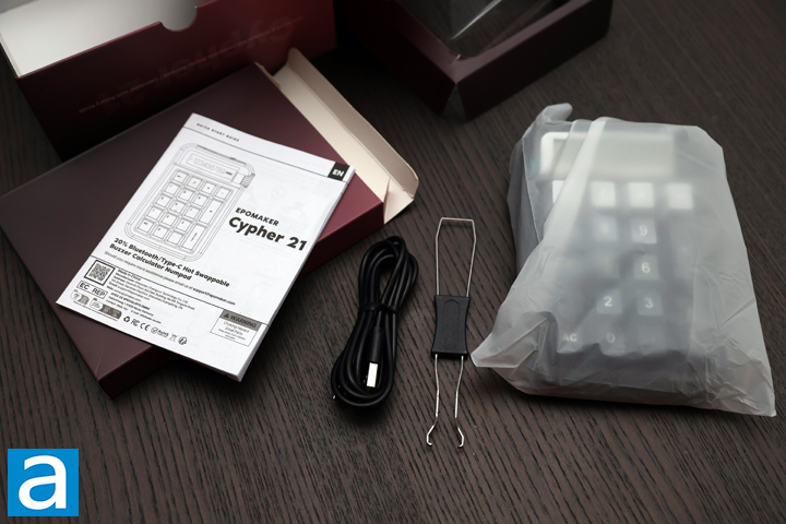 Out of the box, we have the Epomaker Cypher 21 wrapped in a translucent plastic bag and under a clear rigid plastic cover. Underneath, there is a colored box that holds a keycap and switch puller, USB Type-C to Type-A cable, and a quick start guide. The cable is a thin rubber one that measures 1.1m in length, which seems a bit too short for daily use.