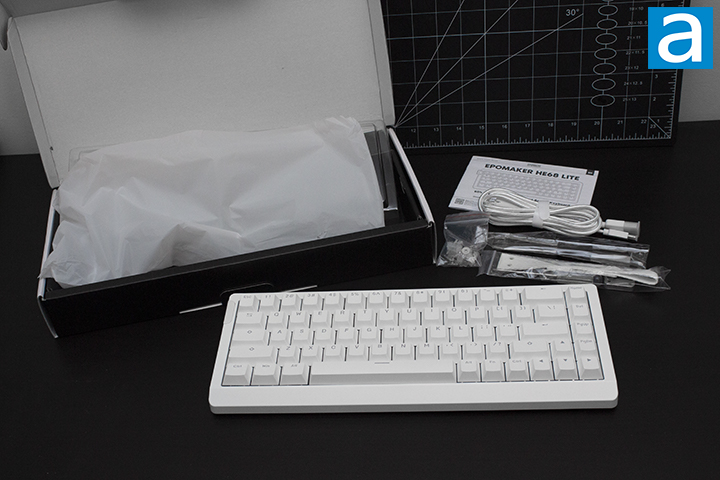 Out of the box, you will receive the Epomaker HE68 Lite keyboard with a cable, keycap/switch puller, extra switches and screws, hand strap with accessories, and a user manual. The keyboard is wrapped in foam to prevent any surface scratches. I was quite pleased when it came to packaging. The quality of the packaging is better than most manufacturers’, as the foam usage surrounds the majority of the keyboard.