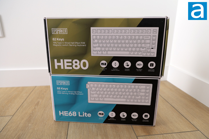 Out of the packaged parcel, we have retail containers of both Epomaker products. Interestingly, there seems to be a more common box style, as both the HE80 and HE68 Lite look like they belong to the same family. It also has similar vibes to the Magcore 87, so hopefully Epomaker has finally found a layout that sticks. Otherwise, the HE80 box is clear with the product name in big letters on the front. A descriptor of "75% Type-C Wired Hall Effect RGB Magnetic-switch Gaming Keyboard" is printed above the name, along with the fact there are eighty-two keys on this board. Other highlighted features include the 75% layout, the Hall effect switches, adjustable actuations, 8kHz polling rate, and customizable RGB backlight. We will explore these features and more later in our review.