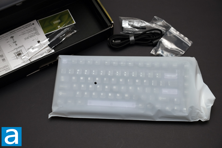 Out of the box, the Epomaker HE80 is in a translucent plastic bag to prevent scratches on the keyboard. We also have several accessories hidden under the box. This includes a wrapped USB Type-C to Type-A cable, set of four extra PBT keycaps, pair of additional Hall effect switches, and a combination keycap-switch puller. There is also a quick start guide for more usage information.