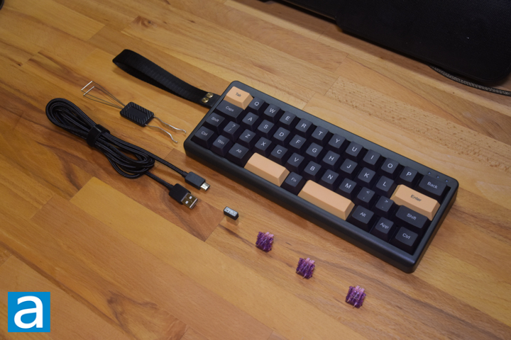 Inside the box, the keyboard is wrapped inside a plastic bag, strap with brass hardware pre-attached to the keyboard, keycap and switch combo puller, braided USB Type-A to USB Type-C cable, 2.4 GHz dongle, manual and three replacement keyswitches.