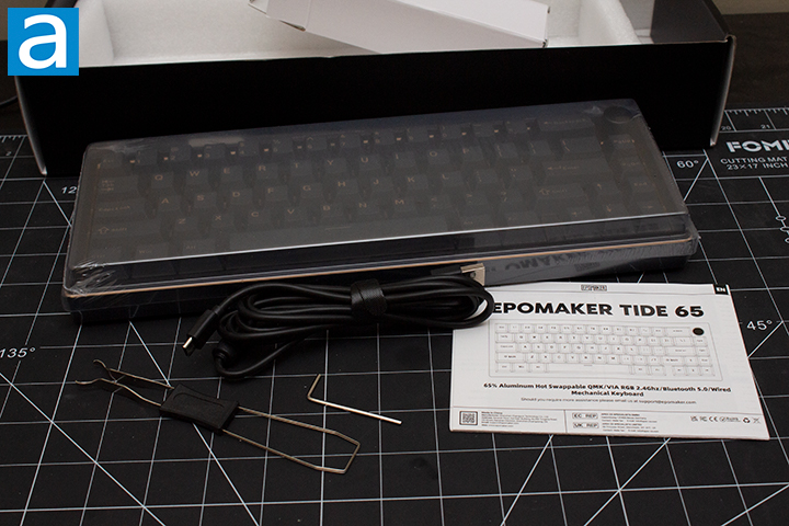 Out of the box, you will receive the Epomaker Tide 65 keyboard with a cable, keycap/switch puller, hex key, and a user manual. The keyboard is wrapped in plastic alongside a plastic cover to prevent any surface scratches. I was pleasantly surprised when it came to packaging. The quality of the packaging is vastly better than most manufacturers, as the foam usage surrounds the entire keyboard.
