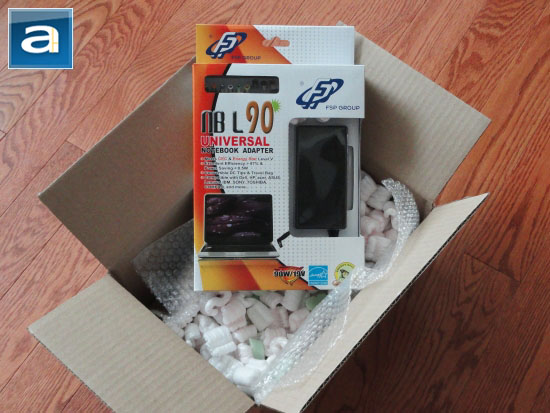 Our notebook power supply, FSP NB L90, came to us in a medium sized cardboard box from FSP Group's office down south in USA -- more specifically, Chino, California. Shipped by UPS, the two pound box made its journey to our office in Calgary, Alberta, Canada; arriving safely without any trace of abuse or damage. A few days later, the "good" dealt its way to my soft but muscular arms in a manner that was most definitely not sketchy, haha.
