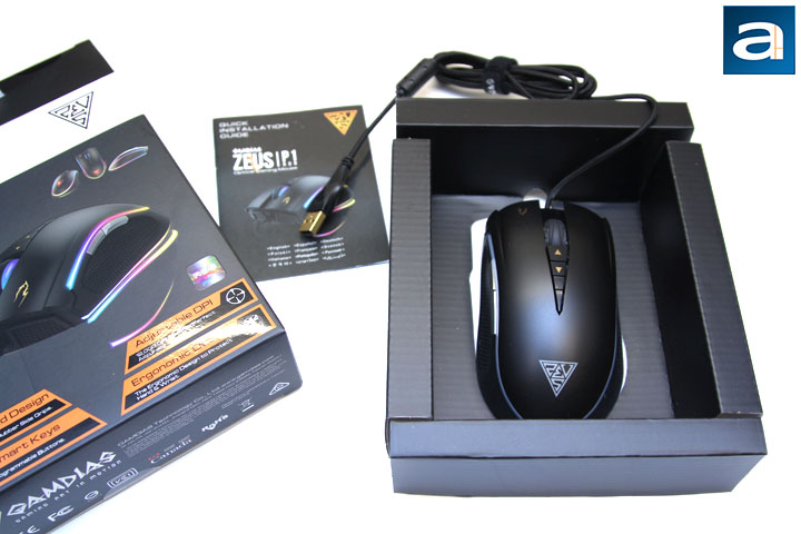 After opening the retail box from the top, the user can pull the black cardboard container out. The GAMDIAS Zeus P1 is held inside of the container. There is not a lot of stuff in the box; just a mouse in a plastic plate, and a quick installation guide. The card indicates the proper steps of how to use the mouse, which I think will not be necessary for a real gamer, right? Unsurprisingly, the driver disc is not provided, since it is 2017, after all.