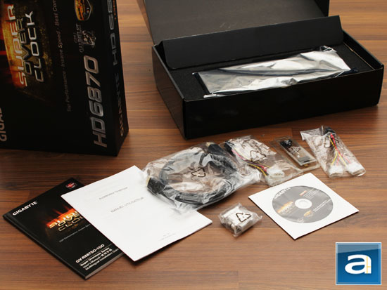 Inside the outer packaging is a thick, black cardboard flap box to protect and accommodate the actual contents. Opening the box with a shiny "Super Overclock" logo in front, a large Styrofoam block can be found with a custom shaped pit accommodates the graphics card, along with a compartment on the side that holds the accessories. Everything is carefully packaged and ensured to be in the right order when the Gigabyte 6870 SOC arrives in the hands of the consumer. Out of the box, you will receive the following contents: