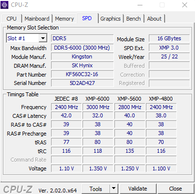 The photo above is a screenshot of the SPD tab in CPU-Z with Kingston's FURY Renegade DDR5-6000 2x16GB installed. The SPD timings table in CPU-Z reads standard JEDEC specifications programmed into the memory along with XMP/DOCP data for running the RAM at various speeds. The ASUS ROG Strix B660-I Gaming WiFi motherboard used for testing was perfectly capable of getting all the information about the FURY Renegade RAM. The Kingston FURY Renegade DDR5-6000 2x16GB retails for about $270 at press time.