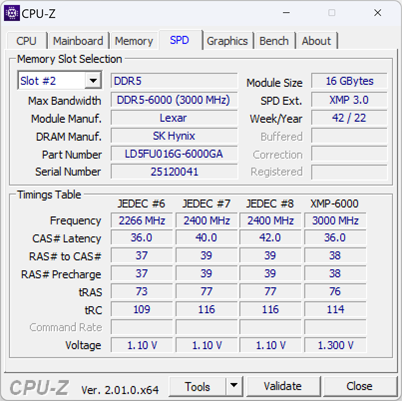 A screenshot of the memory tab in CPU-Z with the Lexar ARES RGB DDR5-6000 2x16GB installed. The SPD timings table in CPU-Z reads standard JEDEC specifications programmed into the memory as well as XMP data for running the memory at various speeds. Our ASUS ProArt Z690-Creator WiFi motherboard used for testing had no issues detecting and working with the ARES RGB RAM right out of the box using the latest BIOS revision. At the time of the product launch, the Lexar ARES RGB DDR5-6000 2x16GB is priced at $150.
